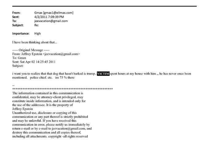 In one email from April 2011, Epstein wrote to Maxwell: “i want you to realize that that dog that hasn’t barked is trump..[VICTIM REDACTED] spent hours at my house with him ,, he has never once been mentioned.” and Maxwell replied: “I have been thinking about that…”