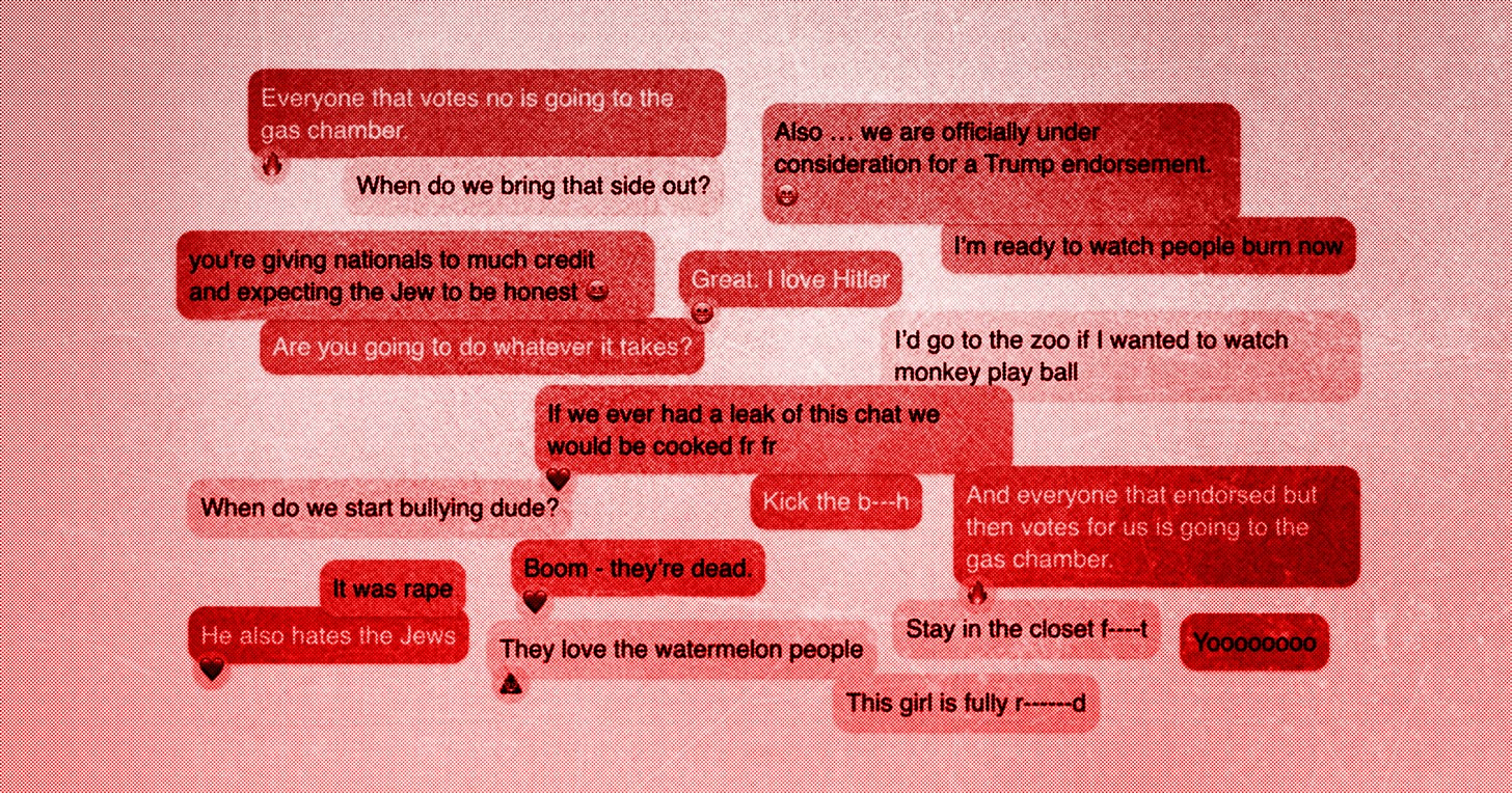 A leaked trove of racist, antisemitic, and violent messages shows rising GOP leaders joking about genocide, slavery, and rape while calling it politics.
